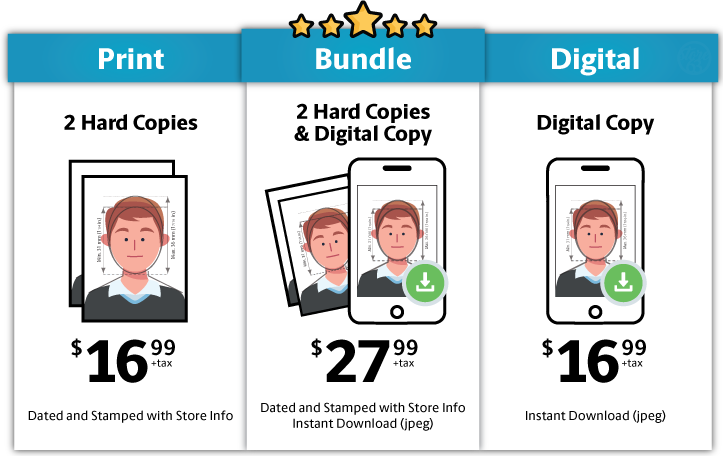 - 2 Extra Hard Copies (sizes 35mm x 45mm, 33mm x 48mm) +$7.99 +tax