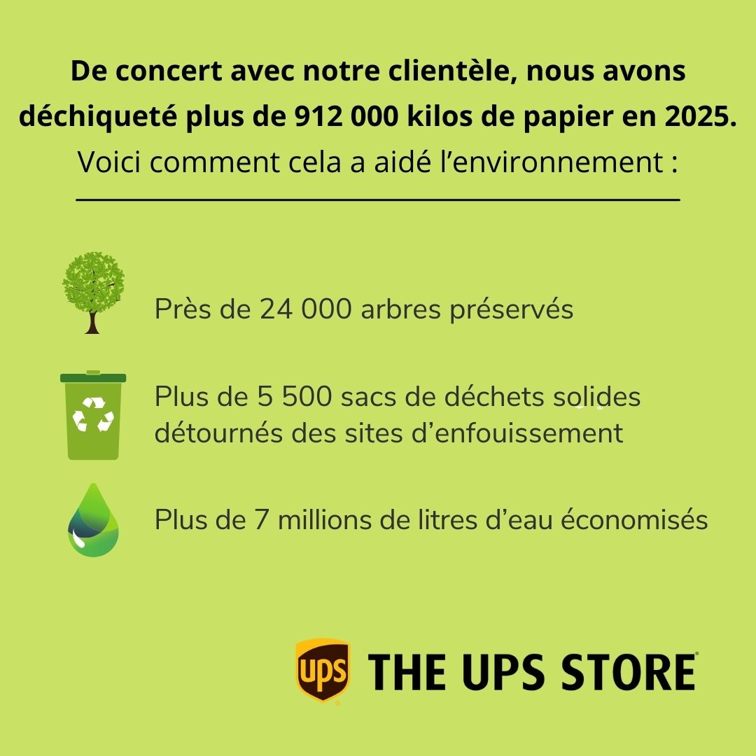 En 2025, les centres The UPS Store au Canada ont déchiqueté plus de 912 000 kilos de papier. Résultats :